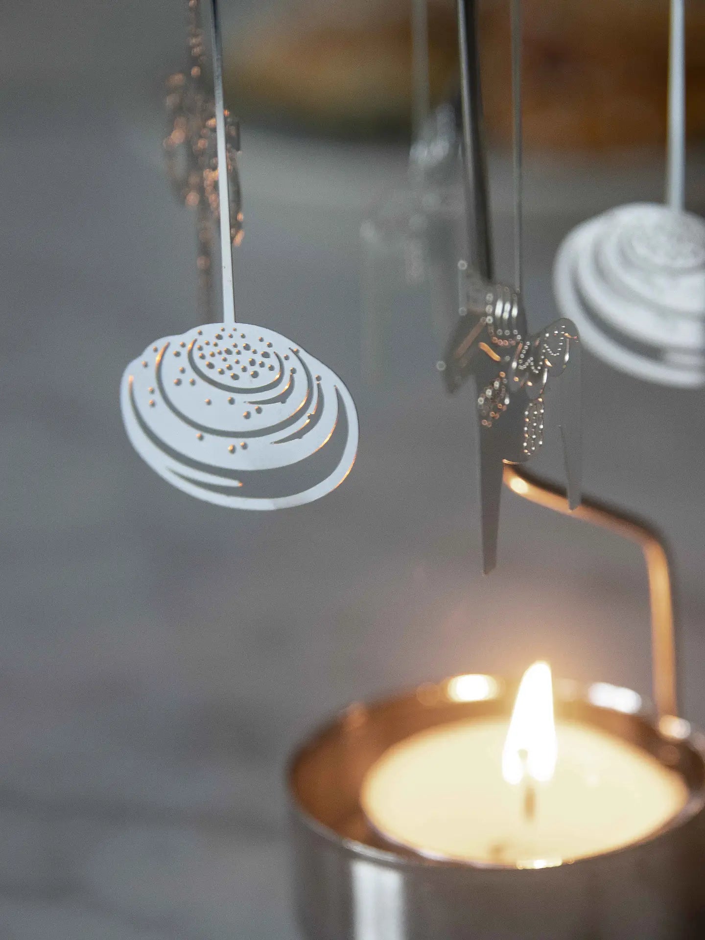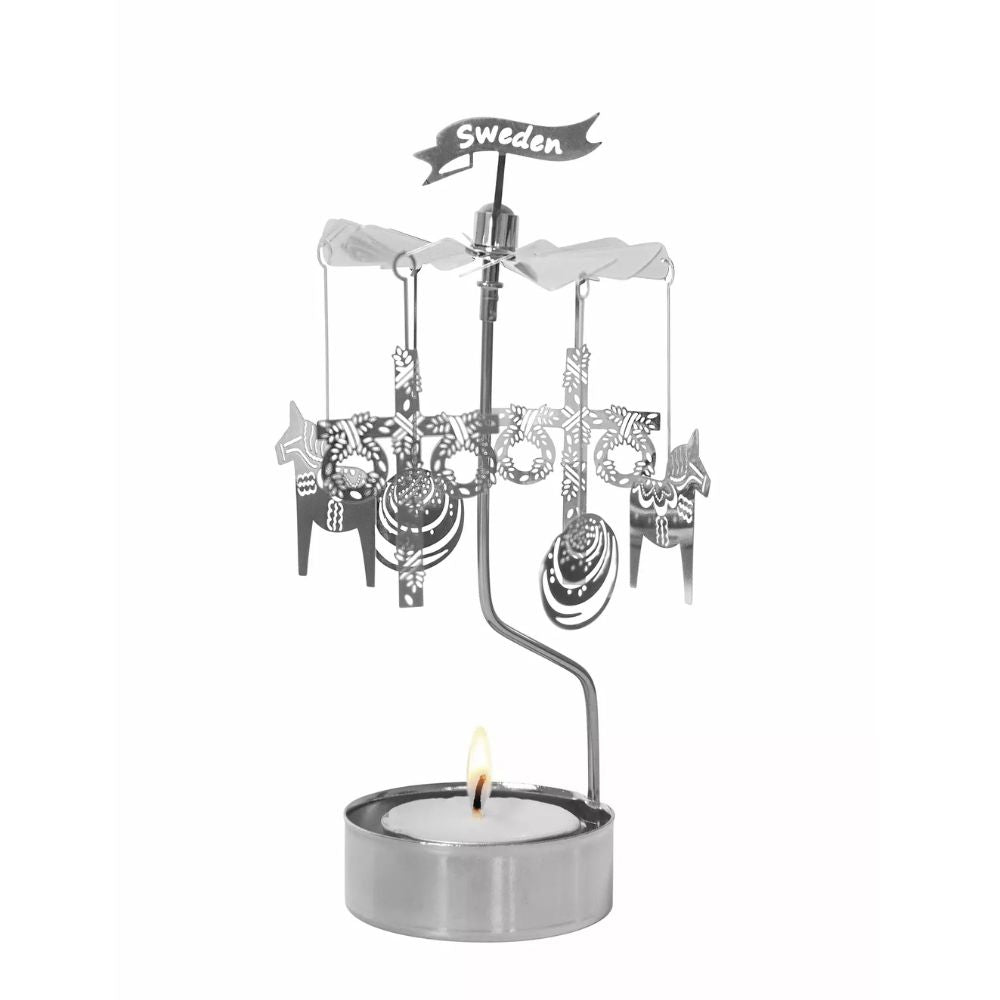 Dreh dich ins Licht. Dieses Windlicht aus silbernem Metall bringt Bewegung in deine Deko. Die Figuren – Zimtschnecke, Midsommar-Stange und Dala-Pferd – drehen sich allein durch die Wärme des Teelichts. Du brauchst keinen Strom. Nur ein bisschen Zeit für skandinavische Gemütlichkeit.