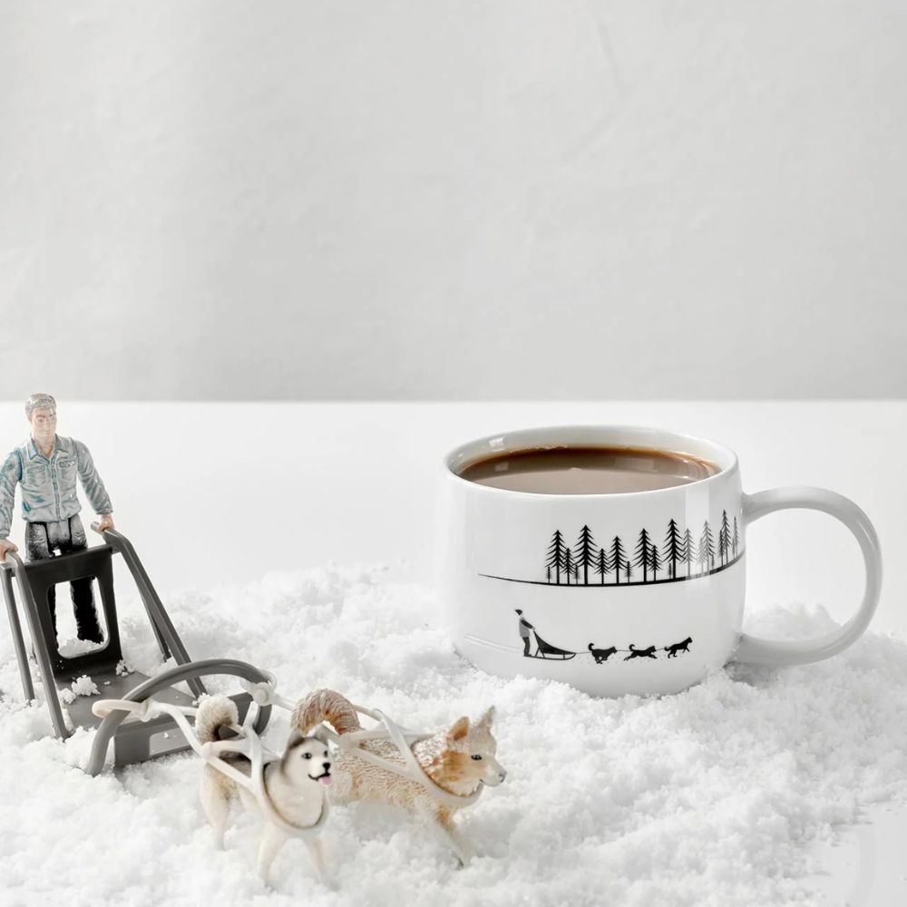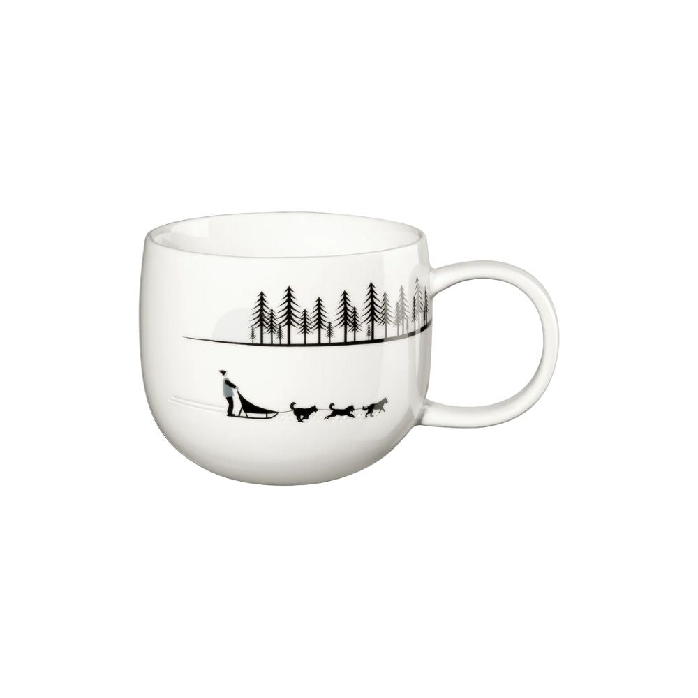 Die Tasse „Snow Tracks“ von ASA Selection erzählt von klarer Winterluft und stillen Momenten im Schnee. Das feine Motiv zeigt einen Schlittenführer mit seinen Hunden vor einer Linie aus schwarzen Tannen – schlicht, nordisch und voller Ruhe.