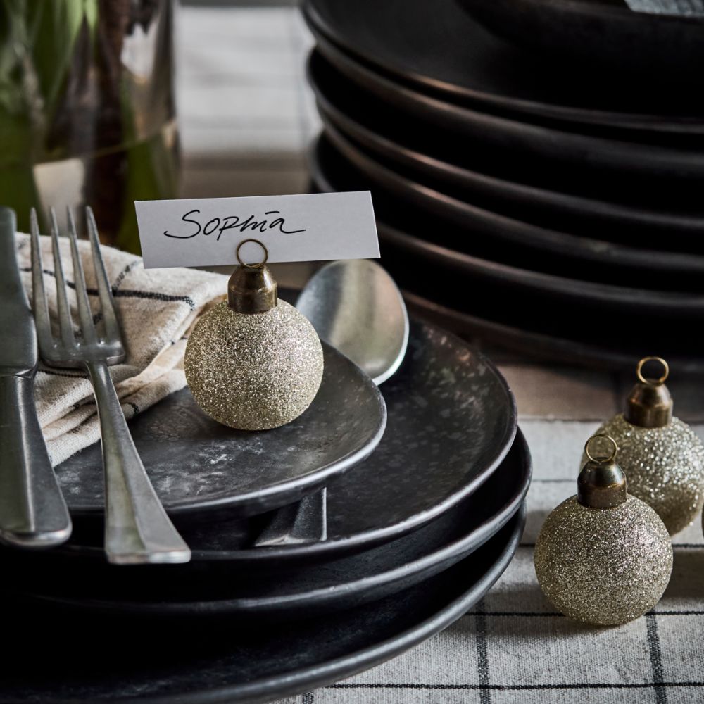 Schöne Kartenhalter in Christbaumkugelform. Eine tolle und festliche Tischdecke.