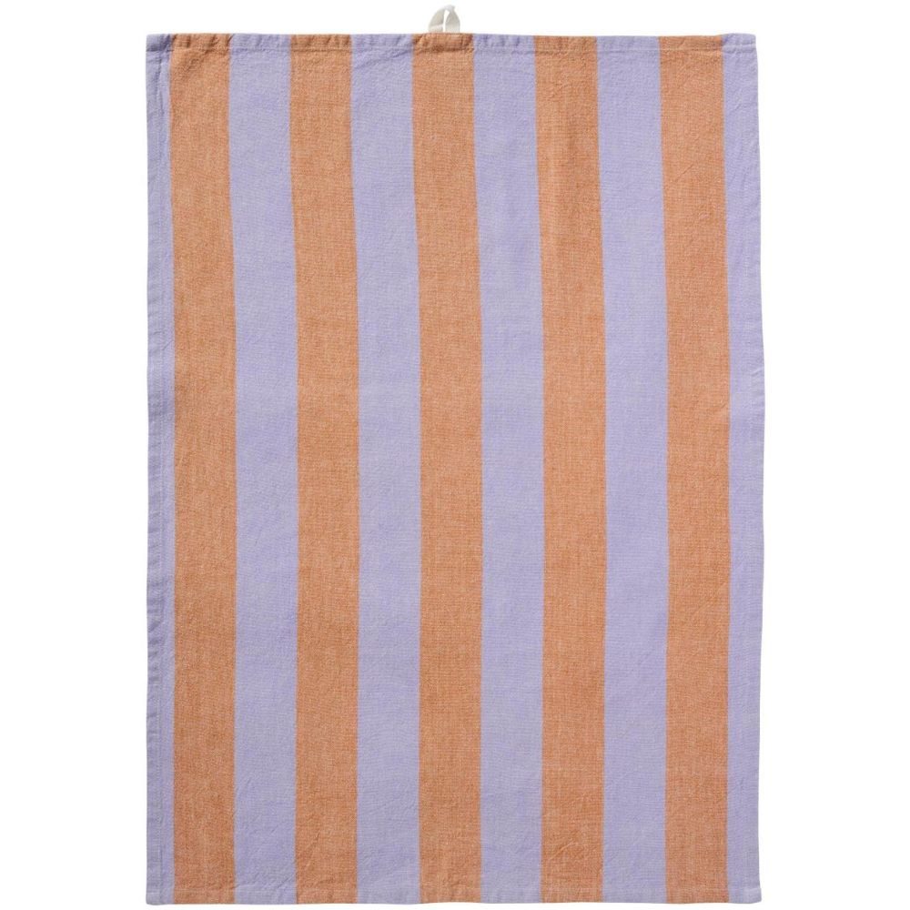 Dieses Geschirrtuch bringt klare Farben in deine Küche. Die breiten Streifen in Lila und Rostbraun wirken modern und warm zugleich. Das Tuch trocknet gut und fühlt sich stabil an. Du hängst es an die Schlaufe und hast es schnell zur Hand.