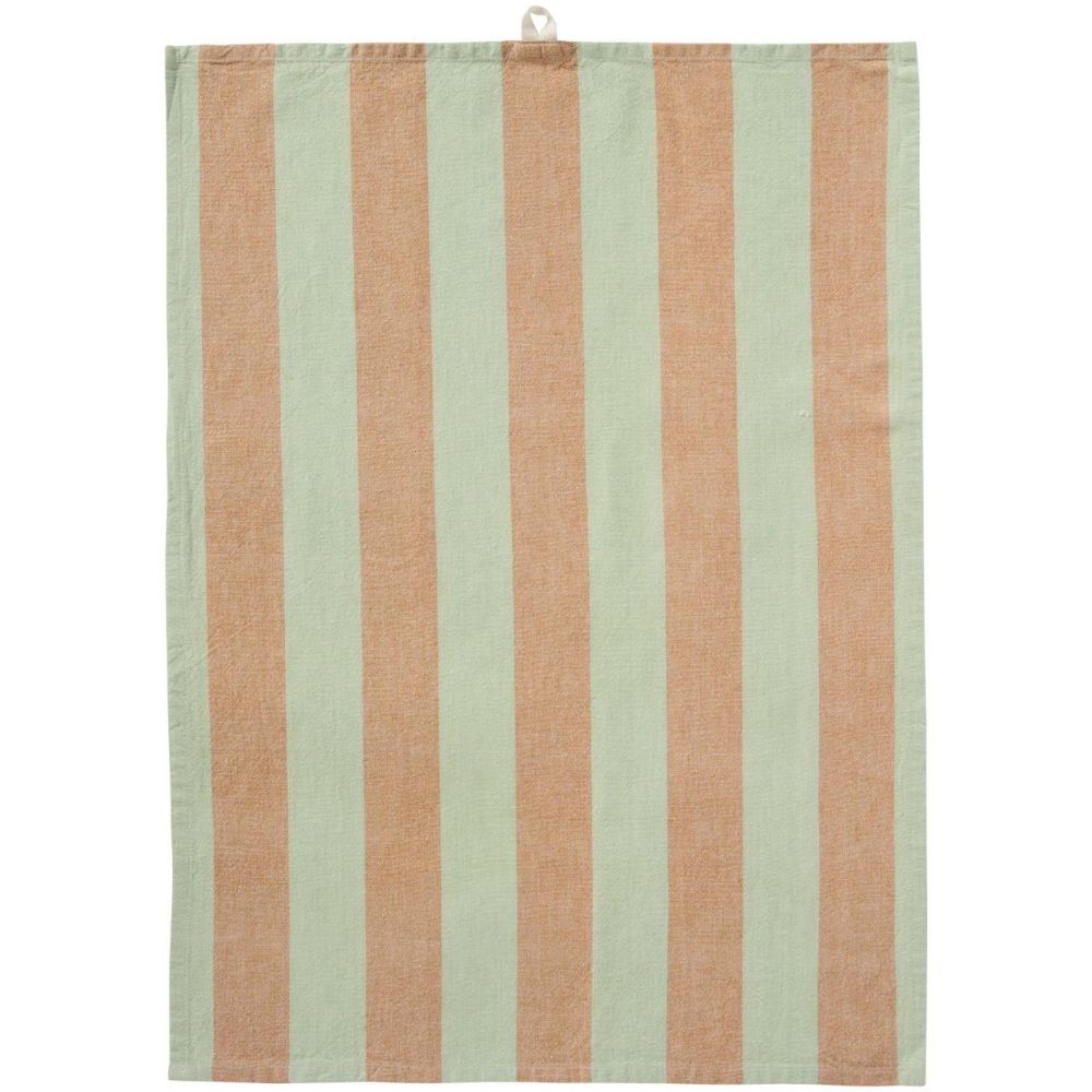 Dieses Geschirrtuch wirkt ruhig und klar. Die breiten Streifen in Hellgrün und Hellbraun bringen eine sanfte Farbstimmung in deine Küche. Das Tuch trocknet gut und fühlt sich stabil an. Du hängst es an die Schlaufe und hast es schnell zur Hand.