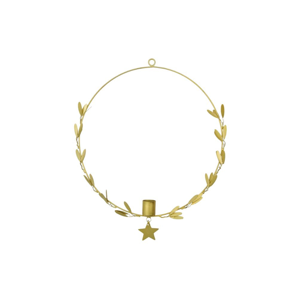 Kerzen sind nicht nur auf dem Tisch ein Hingucker. Mit diesem Kerzenhalter von House Doctor kannst du zu Weihnachten das Licht von der Decke hängen lassen. Der hängende Kerzenhalter mit Messingoptik, Blättern und einem Stern lässt sich prima oben mit einem Band schmücken. Danach einfach eine LED-Kerze hinzufügen und fertig ist der elegante Blickfang. Ideal für Ecken in der Wohnung, die keinen Platz für normale Kerzenhalter bieten. Für einen persönlichen Ausdruck, den Ring mit leichtem Schmuck oder ein paar Zweigchen dekorieren. Aufgrund der Größe des Kerzenhalters, empfehlen wir LED-Kerzen von maximal 16 cm.