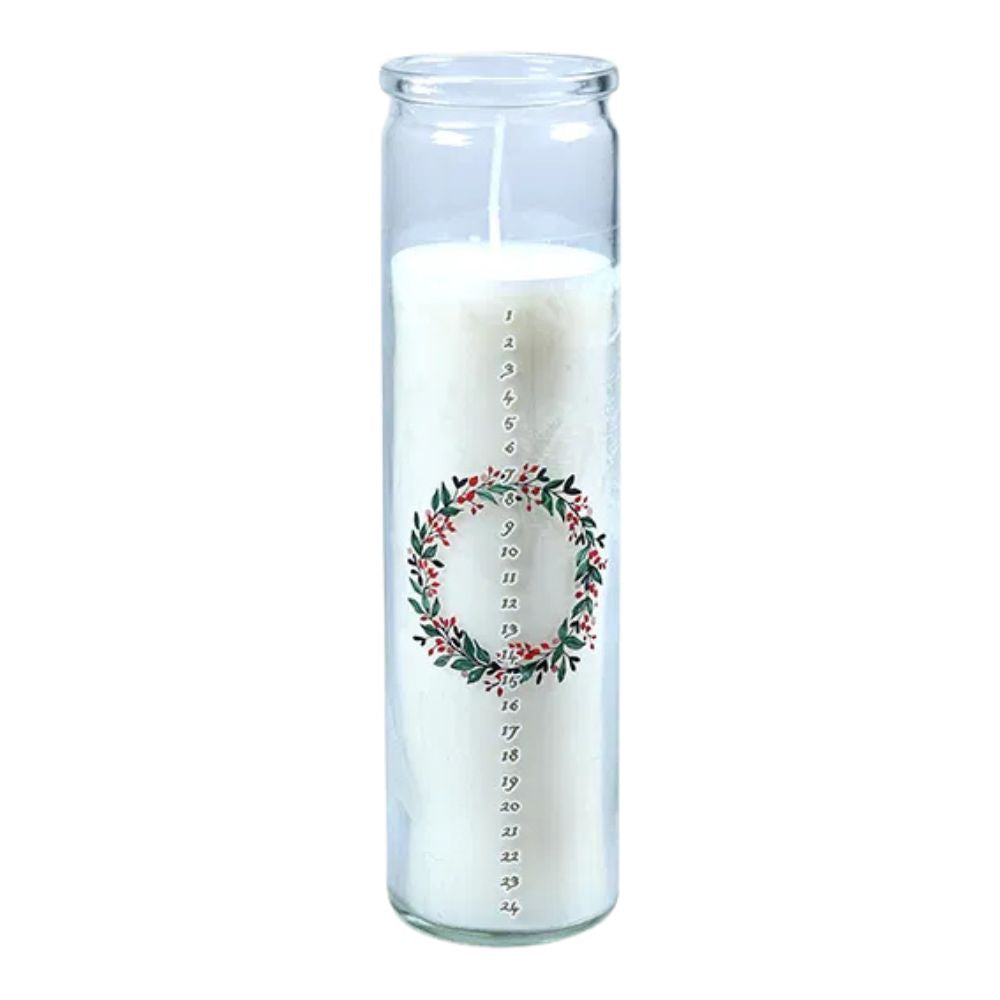 Diese Kalenderkerze verbindet Tradition und Natürlichkeit. Auf dem Glas befindet sich ein stilvoller Kranz aus grünen Zweigen und roten Beeren. In der Mitte und darunter sind die Zahlen 1 bis 24 angeordnet – für das tägliche Abbrennen im Advent.
