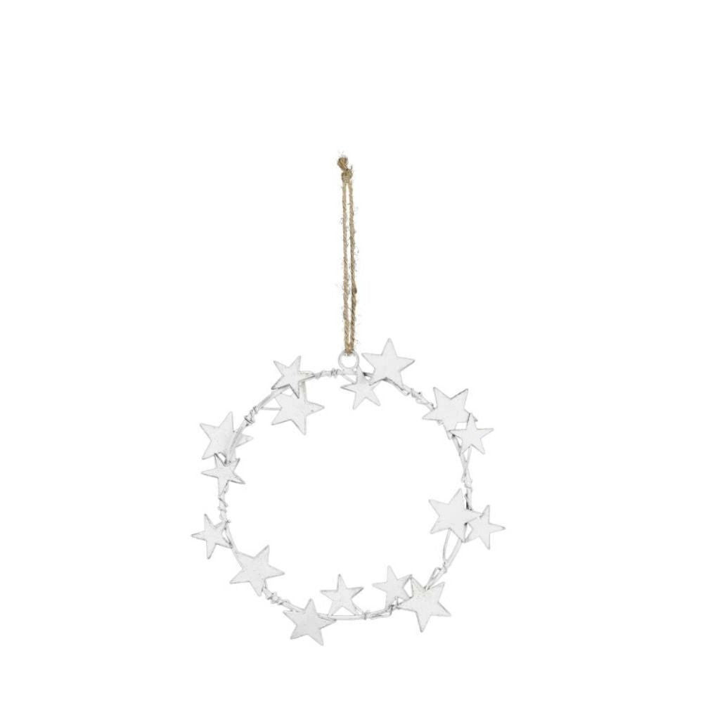 Strahlend schlicht. Der weiße Metallkranz mit Sternen bringt winterliche Frische in dein Zuhause. Du kannst ihn aufhängen oder flach auf den Tisch legen. Kombiniere ihn mit Tannenzweigen, Kerzen oder Holzdeko. Ideal für moderne und skandinavische Looks.