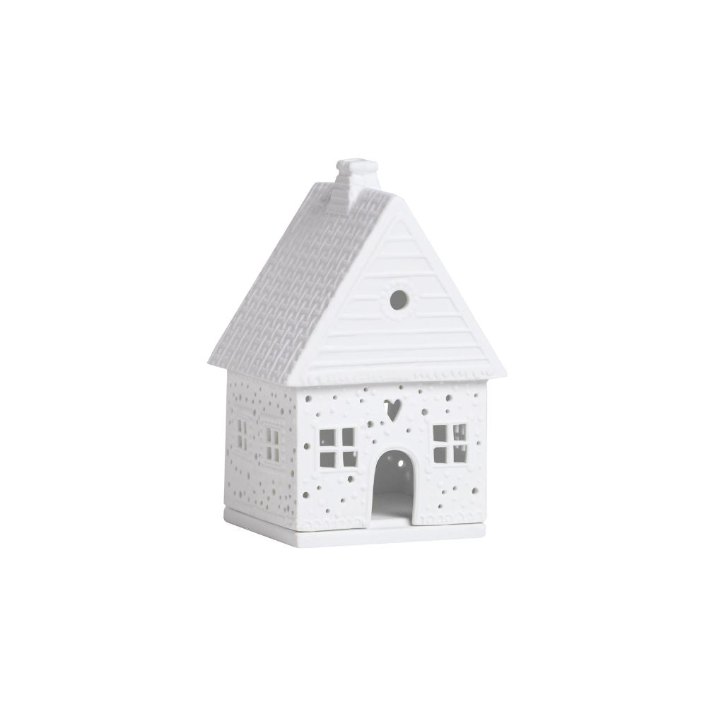 Ein Hauch von Märchen und Weihnachtsduft – das Räder Lichthaus Lebkuchen klein erinnert an ein winterliches Lebkuchenhäuschen voller Geborgenheit. Das matte Porzellan ist fein strukturiert und zeigt verspielte Details wie Herz- und Punktmuster, die das Kerzenlicht sanft hindurchschimmern lassen.