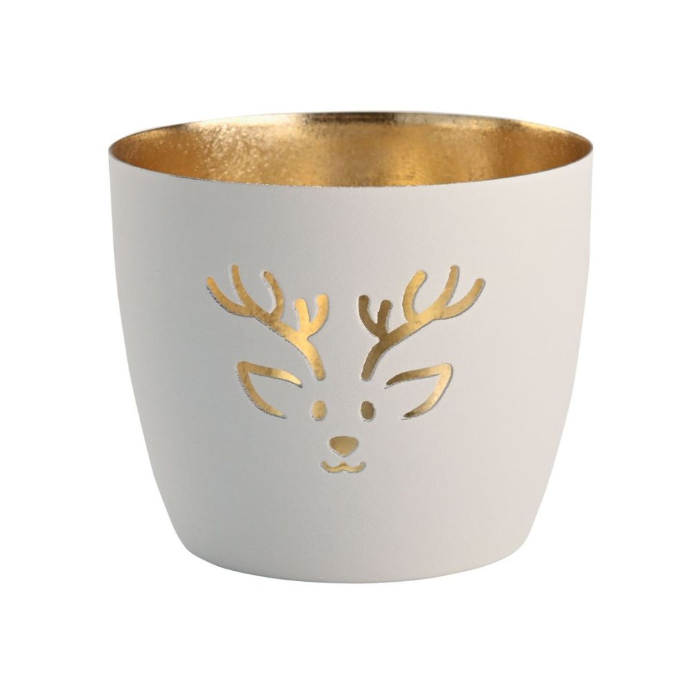 Das Madras Windlicht mit Rentiermotiv bringt festliche Gemütlichkeit in dein Zuhause. Außen in elegantem Weiß und innen in warm schimmerndem Gold gehalten, sorgt es für stimmungsvolle Lichtreflexe. Durch die ausgestanzte Rentierform leuchtet das Kerzenlicht besonders schön und zaubert eine weihnachtliche Atmosphäre.