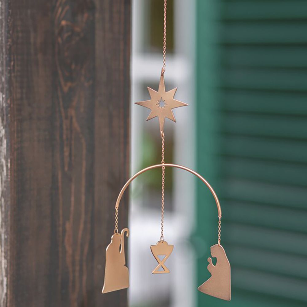 Fein aus goldfarbenem Metall gefertigt, zeigen die schwebenden Silhouetten Maria, Josef und das Jesuskind unter dem leuchtenden Stern von Bethlehem.