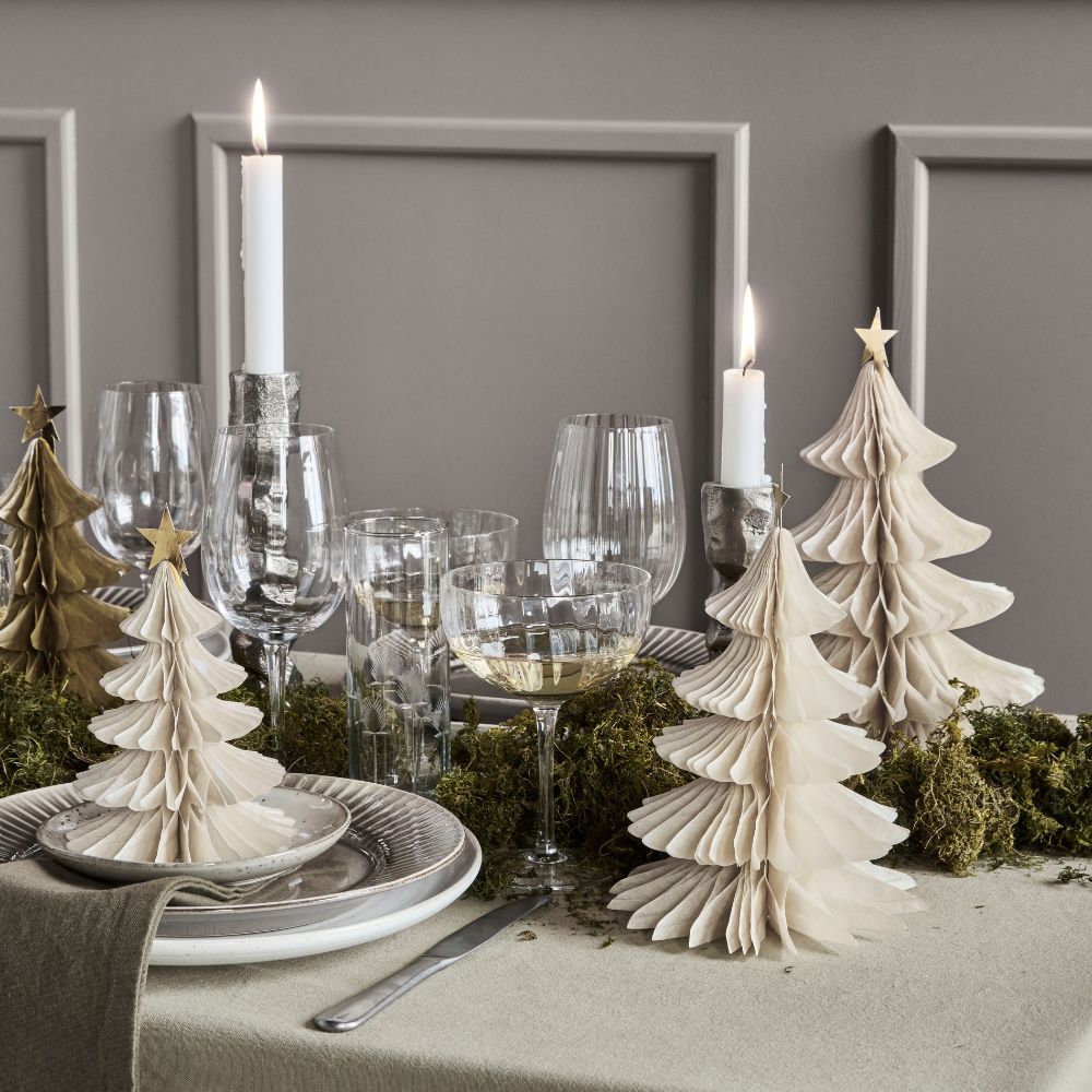 Die Papierbäume von House Doctor in sanftem Ivory bringen ruhige Eleganz in deine Weihnachtsdekoration. Das Set besteht aus drei Bäumen in unterschiedlichen Größen, jeweils mit einem goldenen Stern als feines Detail.