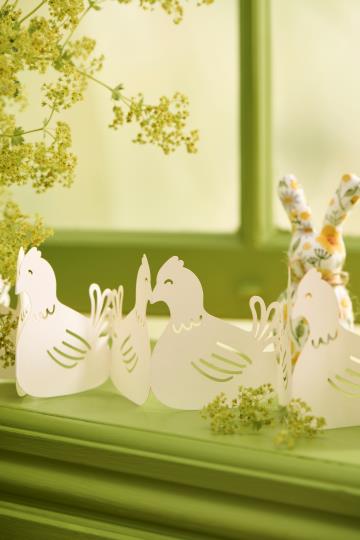 Diese Tischdekoration mit Hühnern aus Papier passt perfekt auf deinen Ostertisch. Der feine Scherenschnitt bringt Leichtigkeit und eine ruhige, festliche Stimmung. Durch das clevere Falt-Design steht die Dekoration frei auf dem Tisch. Du stellst sie als Mittelstück auf oder kombinierst sie mit Geschirr, Kerzen und Naturmaterialien. Ideal für Ostern, Frühlingsfeste und liebevoll gedeckte Tafeln.