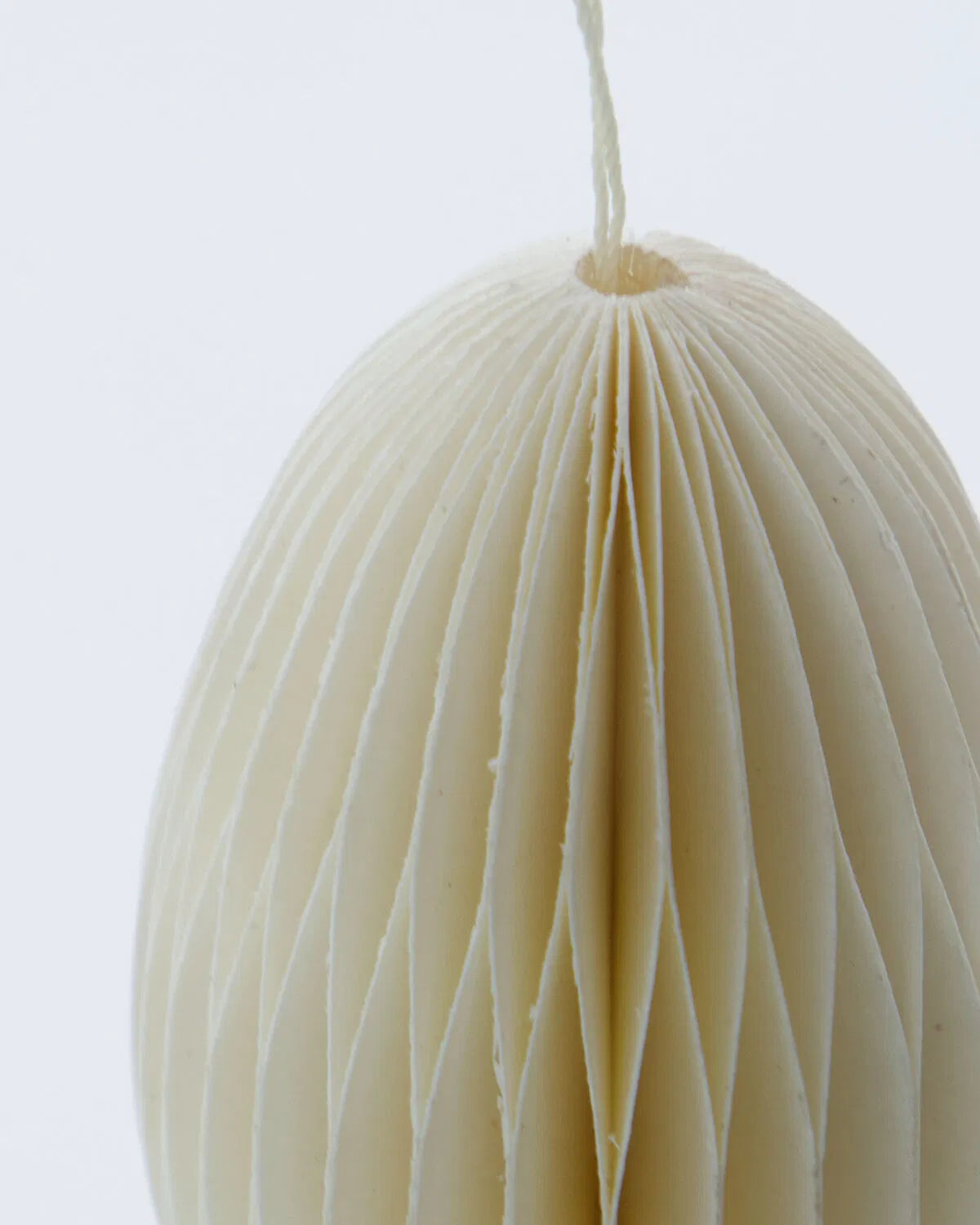 Die Eier sind fein gefaltet und zeigen eine klare Wabenstruktur. Die Farbe Off-White passt zu Naturtönen, Holz und Keramik. Die Formen bleiben zurückhaltend und ruhig.