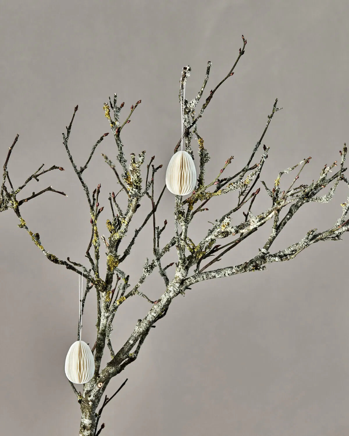 Das Set besteht aus sechs Eiern. Jedes Ei ist leicht und lässt sich einfach aufhängen. Eine schlichte Ergänzung für dein Zuhause zur Osterzeit.