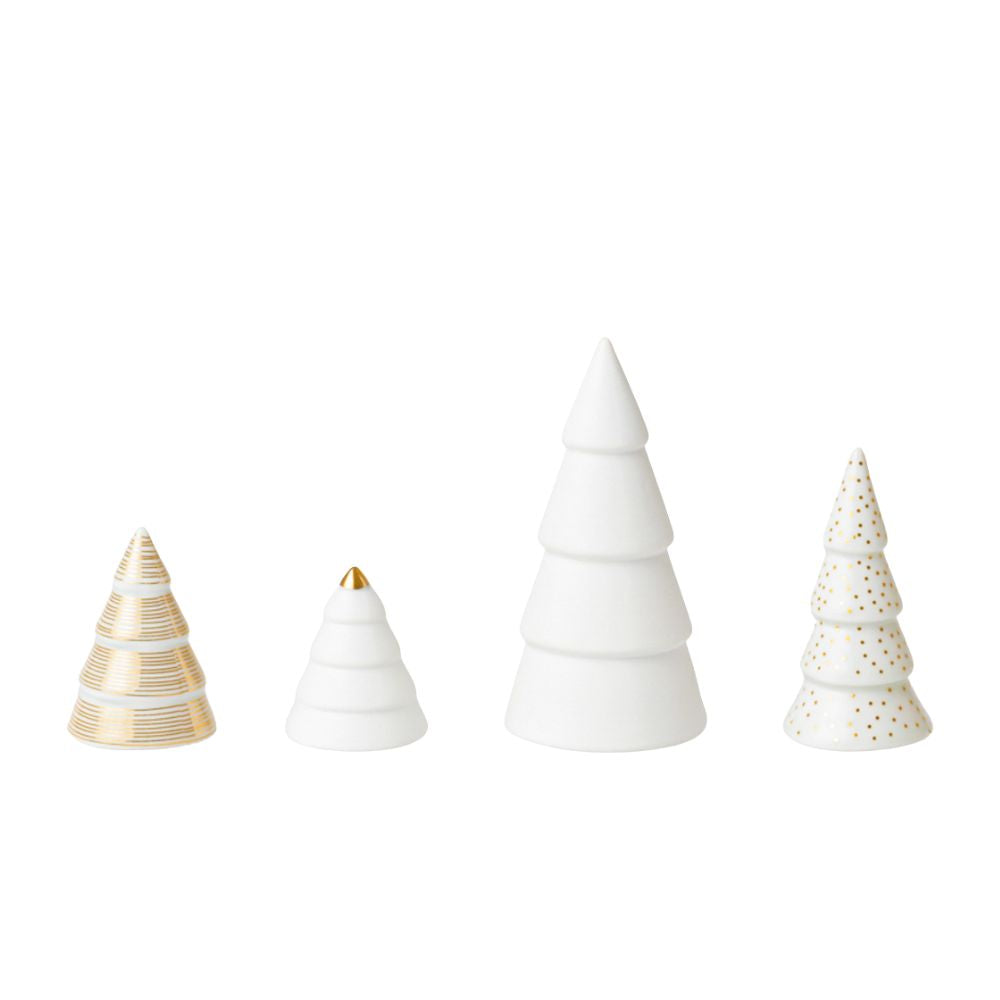 Schlichte Eleganz trifft auf festlichen Zauber – das Räder Tannen Set vereint vier stilvolle Porzellanbäumchen in harmonischem Design. Jeder Baum ist einzigartig gestaltet – mal schlicht mattweiß, mal mit feinen goldenen Linien oder zarten Punkten veredelt.