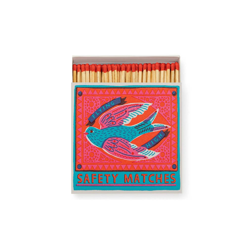 Diese Streichhölzer von Archivist Gallery bringen Farbe in dein Zuhause. Das Motiv Flying High zeigt einen stilisierten Vogel in kräftigen Tönen. Du stellst die Box sichtbar neben Kerzen oder Laternen. Sie wirkt wie ein kleines Designobjekt. Die Hölzer lassen sich gut greifen und zünden zuverlässig.