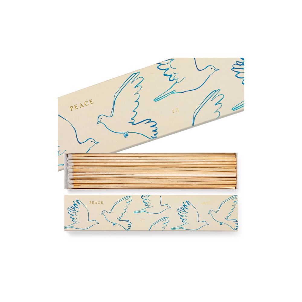 Diese langen Streichhölzer von Archivist Gallery kommen in einer schmalen Box mit stilisierten Friedenstauben. Das Design wirkt ruhig und klar. Du nutzt die Hölzer zum Anzünden deiner Kerzen, Laternen oder des Kamins. Durch die Länge lassen sie sich gut handhaben. Die Box darf sichtbar liegen. Sie setzt einen leichten, freundlichen Akzent.