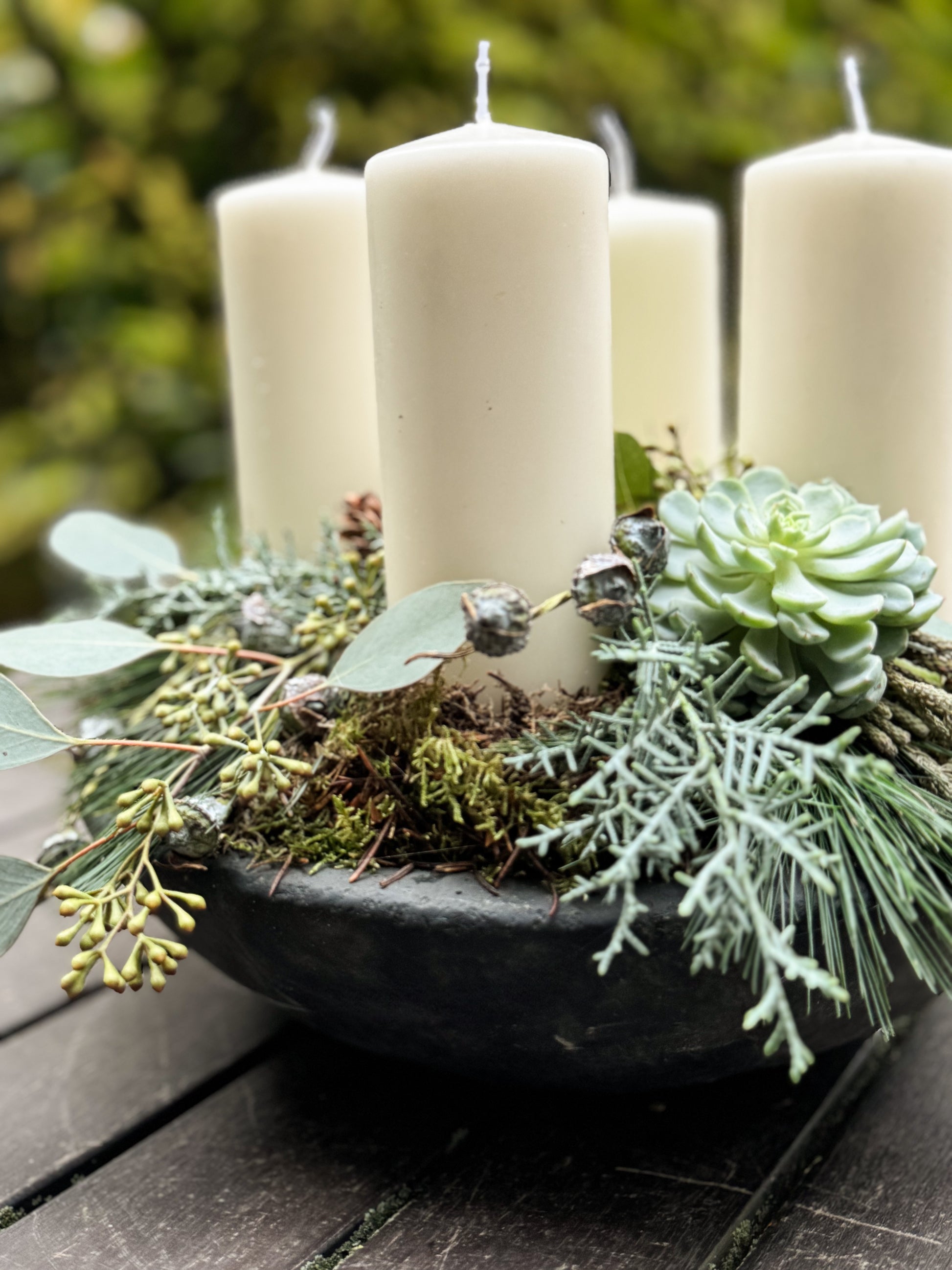 In unserem Adventskranz-Workshop gestalten wir natürliche Kränze in grauen Betonschalen – mit wintergrünem Beiwerk, Moos, Eukalyptus und feinen Zapfen.