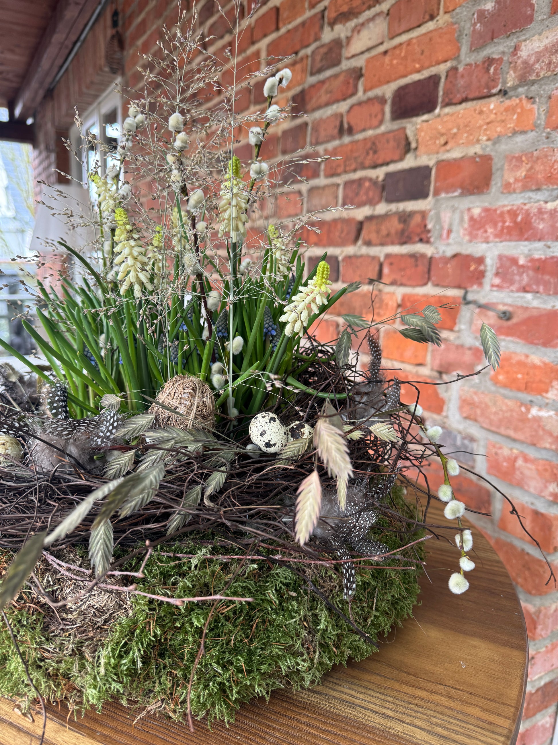 Du gestaltest ein natürliches Nest mit frischen Frühblühern. Du arbeitest mit Moos, Zweigen und zarten Blüten. Du setzt die Pflanzen in ein Nest und dekorierst sie mit kleinen Akzenten. So entsteht ein lebendiges Arrangement für dein Zuhause.