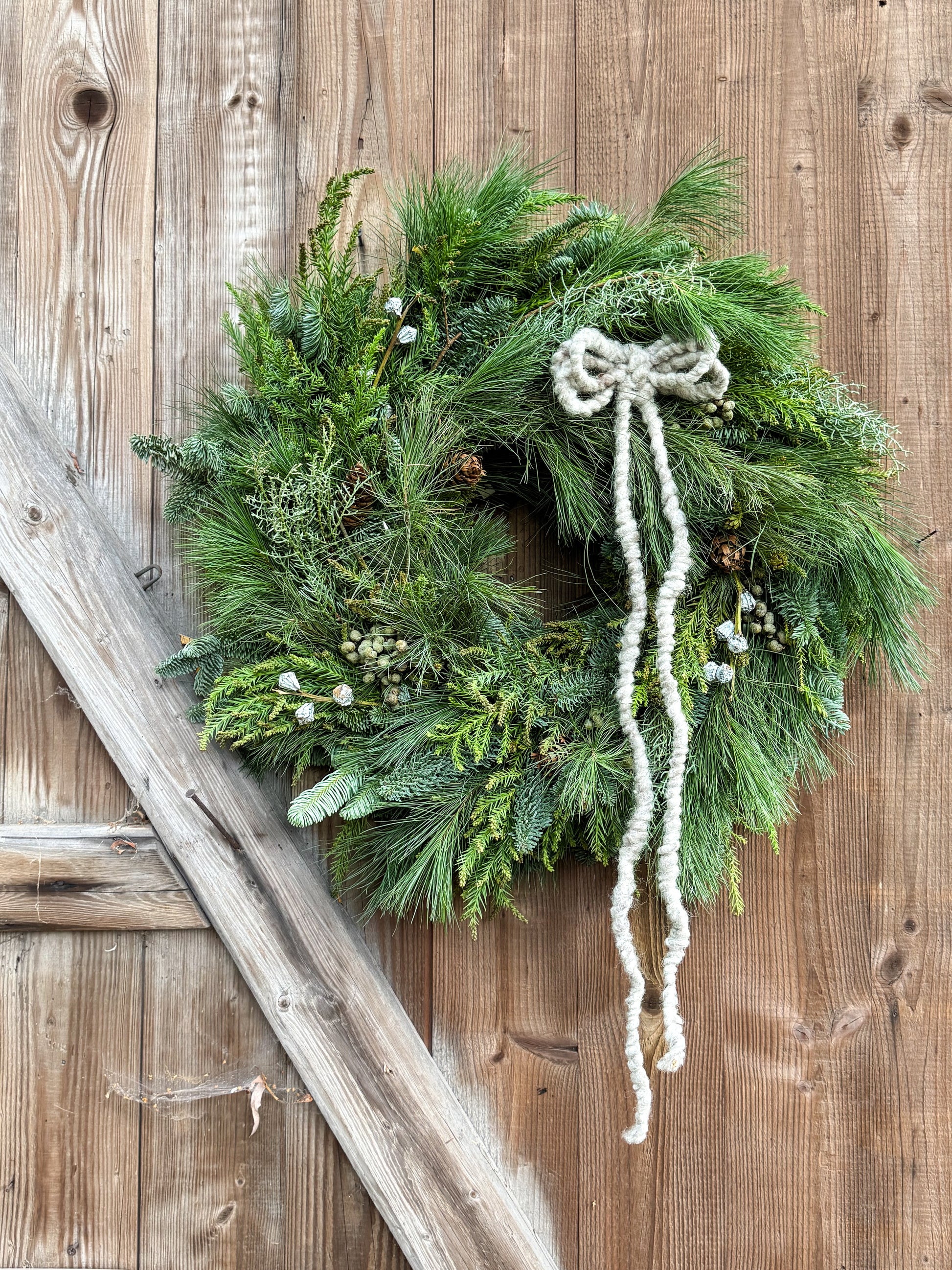 Du bindest deinen eigenen Wintertürkranz – wild, natürlich und voller Wintergrün. Gemeinsam gestalten wir einen Kranz aus frischer Zypresse, Tanne, Kiefer, Bergkiefer, Eukalyptuskapseln und Tropthumeria. Du arbeitest komplett selbst, Schritt für Schritt angeleitet. So entsteht ein echter Unikat-Kranz, der nach Wald duftet und deinen Eingang schmückt.